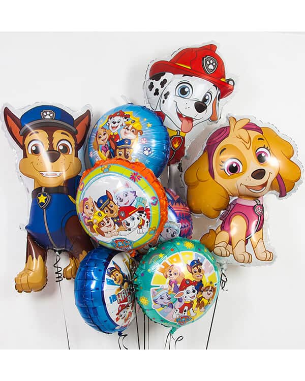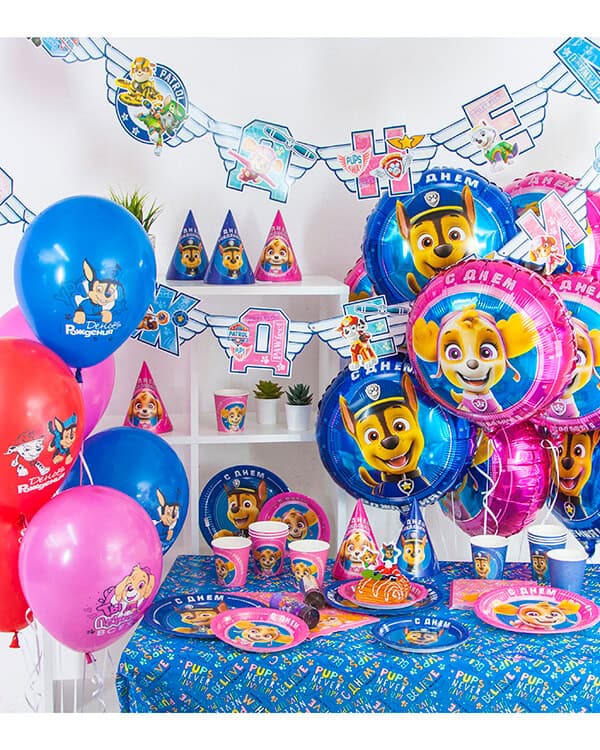 • фольгированные аксессуары с изображениями культовых персонажей — здесь вы найдете полицейского гонщика Чейза, очаровашку Скай, малыша Крепыша, горного рейнджера Эвереста, пожарного бойца маршала. Вся команда хвостатых спасателей в сборе!;